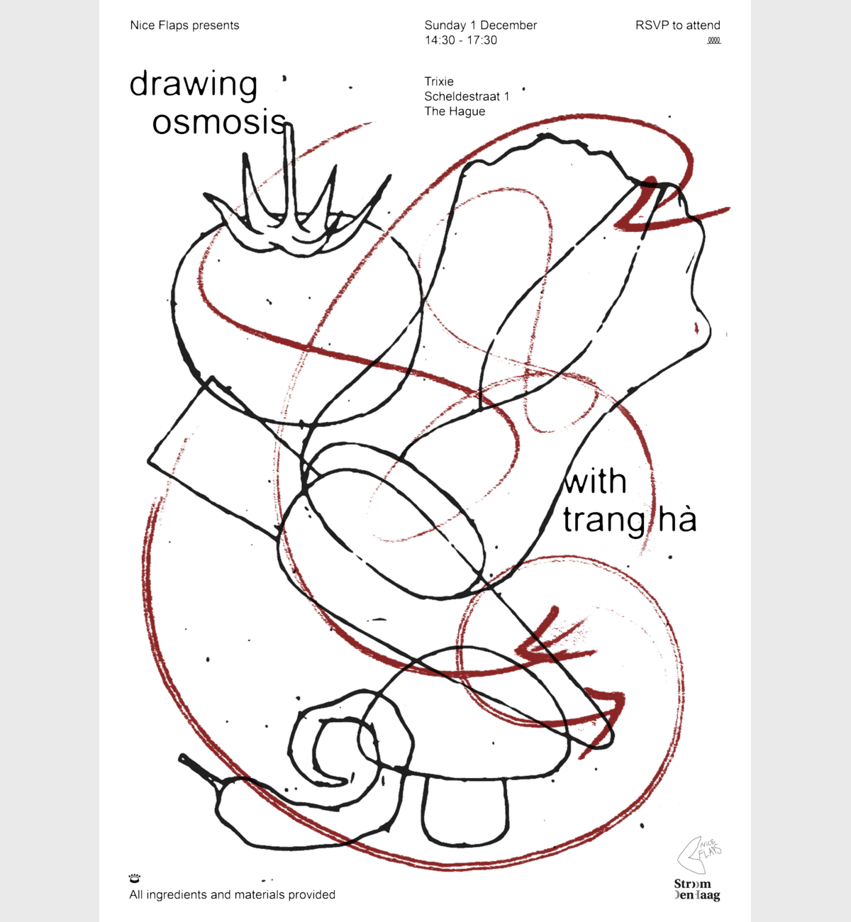 Nice Flaps (@niceflaps) presents an intimate drawing session in collaboration with Trang Hà (@terrafic.soup) that revolves around the idea of ‘osmosis’. In cooking, osmosis happens when matters and fluids exchange their level of salinity or water. For our session, we will reenact this process by setting up a big pot of simmering broth. Into the pot, someone throws in an ingredient, one after another, prepared as the person wishes. The room will proceed in a full movement of exchange, drawing each stage as an ingredient goes missing from the table, yet appearing in the broth, the smell, and on the canvas. The session will be accompanied by music of and by live music by Tuấn Anh (@_tuananh.do).