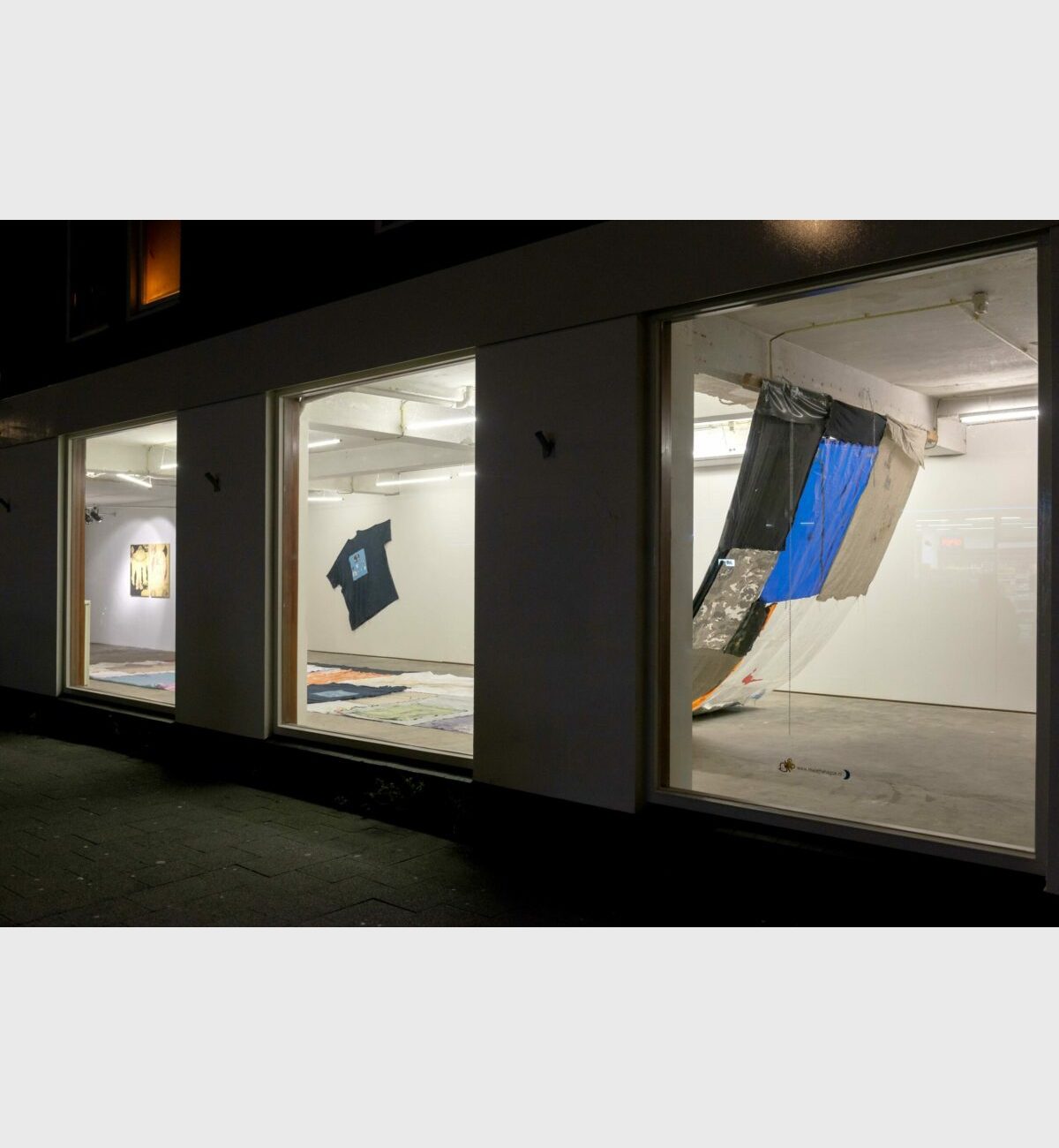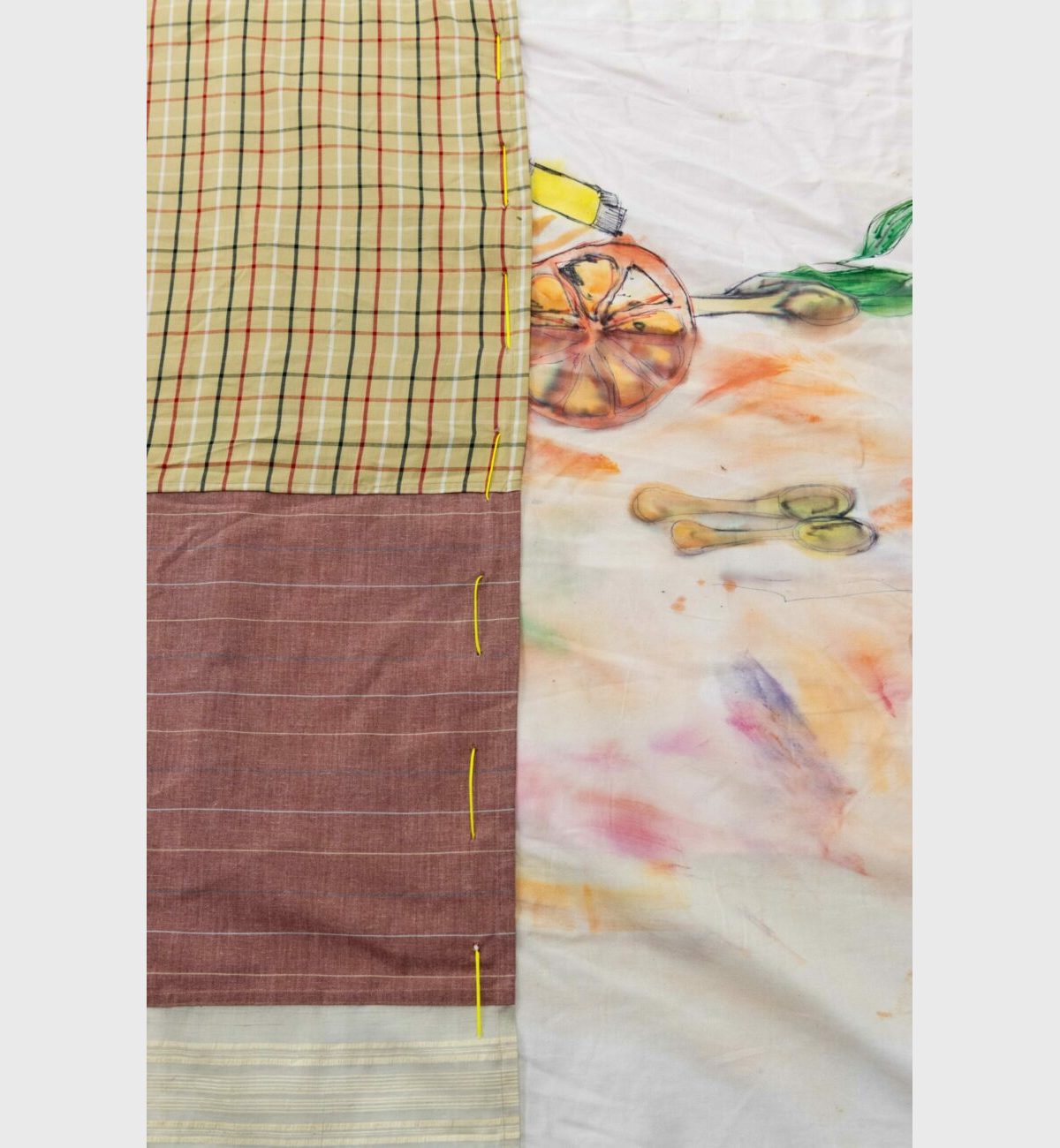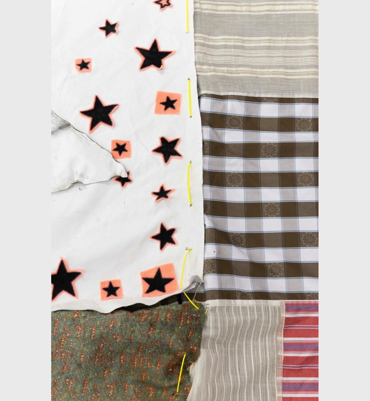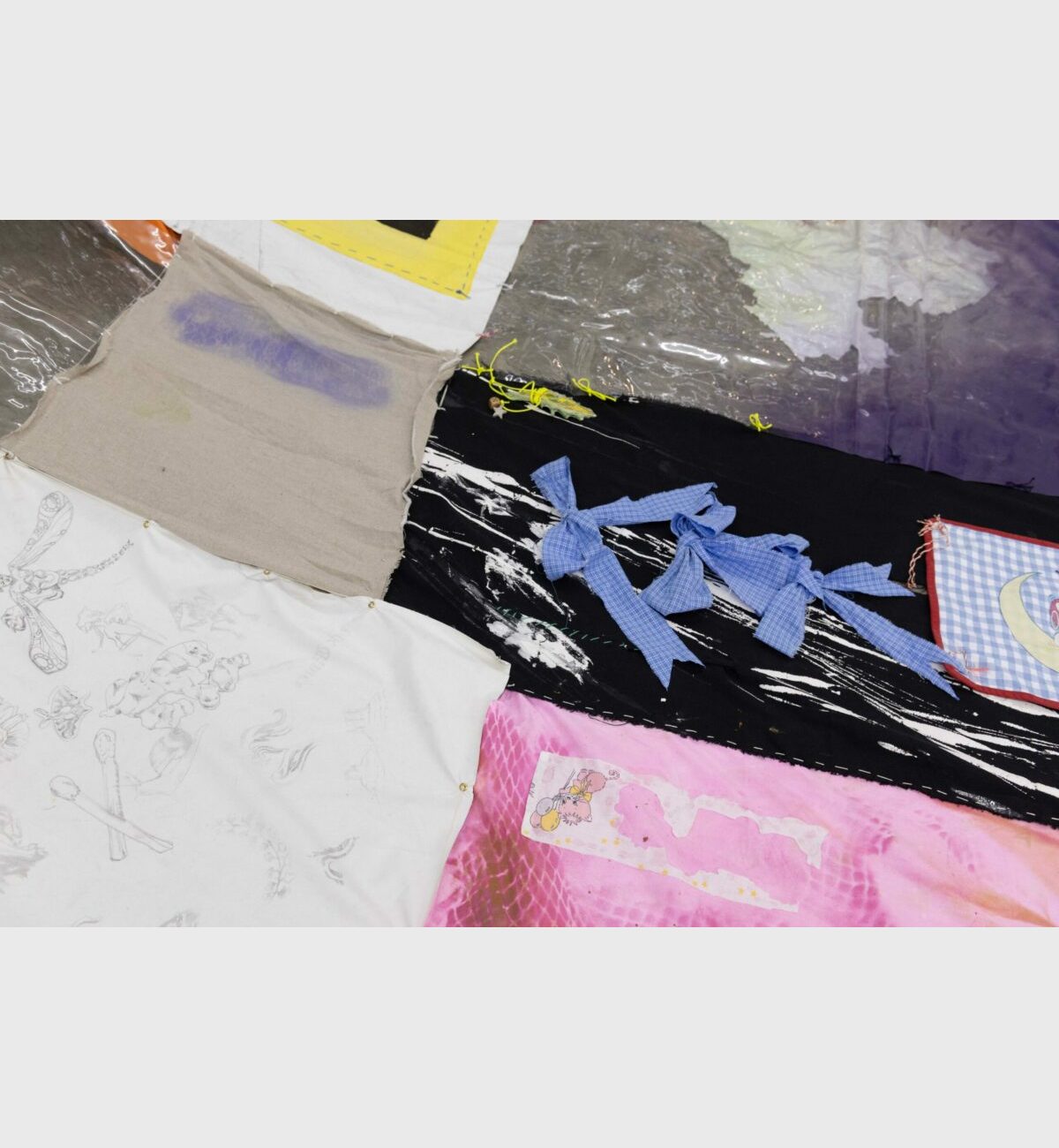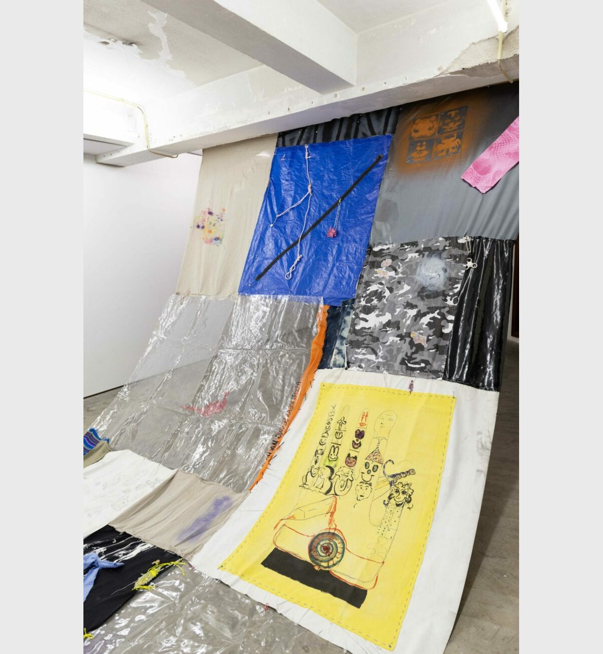 All of these thoughts by the collective were then translated into a series of “patchworks”; a patterned network of relationships that constitutes a coherent whole. In this, patchworking is a metaphor for building relationships across scales; of individuals, groups and institutions, of forming a stable whole from patterns of individual components; in essence a necessary precondition for working and living collectively. By choosing to make a patchwork the collective translated this idea into a physical patchwork; a monumental collaborative textile work occupying the centre of the gallery space. Supporting this central work are a series of collaborative paintings and audio and video works, similarly developed in the mode of ‘patchworking’.